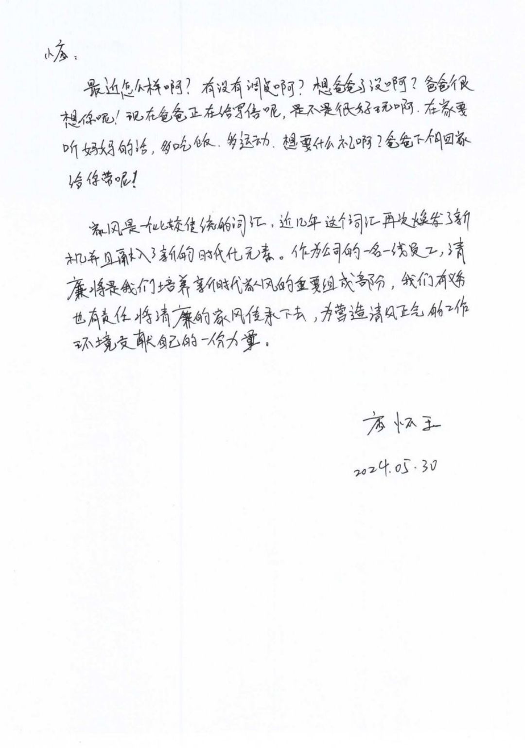 为认真贯彻落实习近平总书记提出的“注重家庭、注重家教、注重家风”指示精神,推进家庭文明和良好家风建设,5月21日至5月30日,宁西公司工会组织开展“乐享亲子时光 共建文明家庭”为主题的六一线上活动,共有24组家庭参加,收到来自各家庭投稿的书画、声乐表演等作品,在一篇篇真挚情感流露的书信中、线条色彩飞舞的画卷里、倾情演奏的展示中,节日氛围被烘托到了极致。