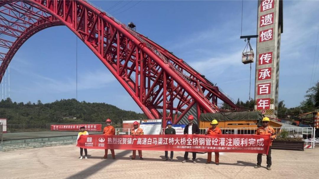 4月12日,伴随着最后一方混凝土泵送完成,镇广高速通广段控制性工程白马渠江特大桥全桥钢管混凝土灌注顺利完成,标志着该桥建设迈入桥面吊装施工冲刺阶段。