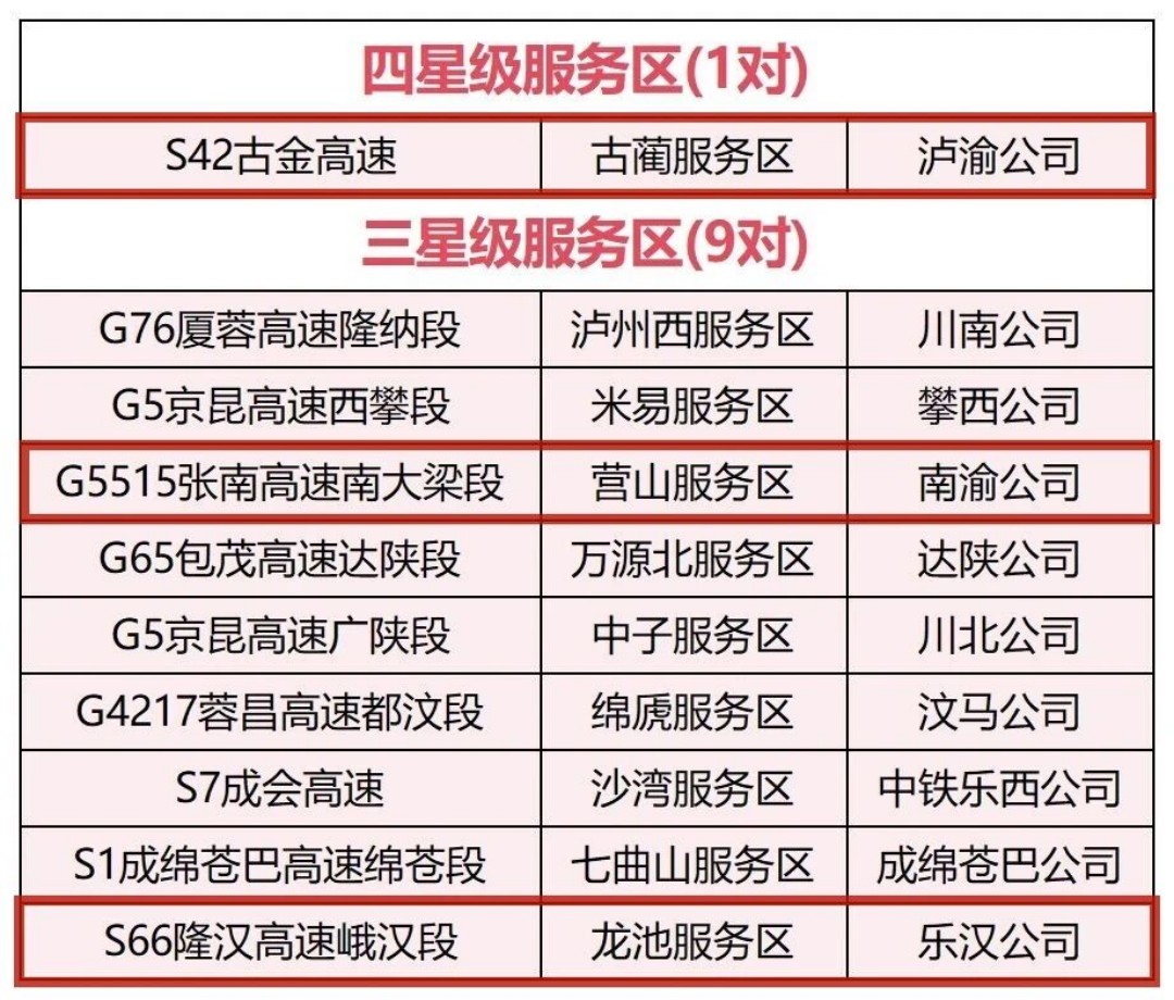 近日,四川省交通运输综合行政执法总队、四川省交通运输厅高速公路管理局联合印发了《关于2025年全省高速公路服务区星级评定结果的通知》,williamhill官网多家所属公司运营服务区上榜——泸渝公司古蔺服务区获评2025年度全省唯一“四星级服务区”称号,南渝绵南公司营山服务区、乐汉公司龙池服务区获评“三星级服务区”称号!
