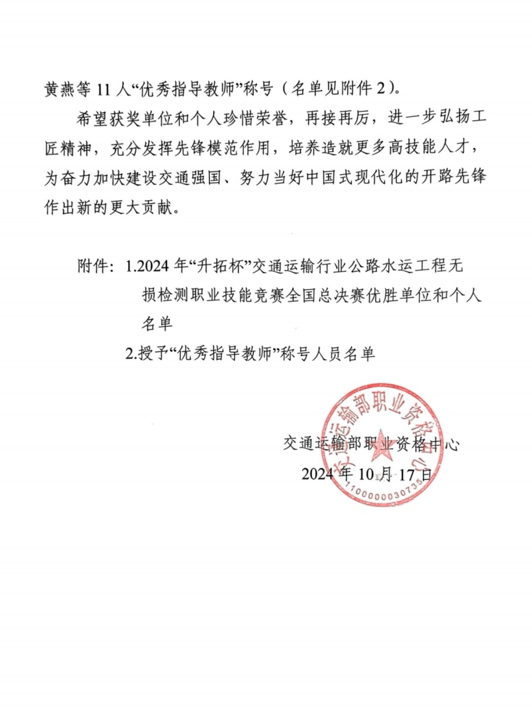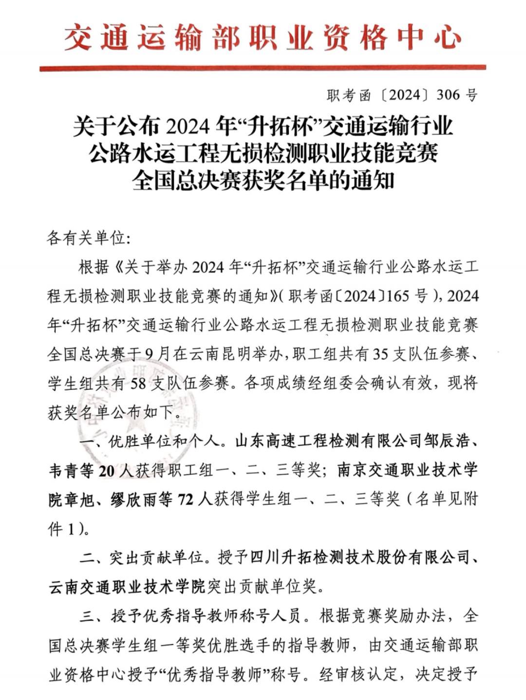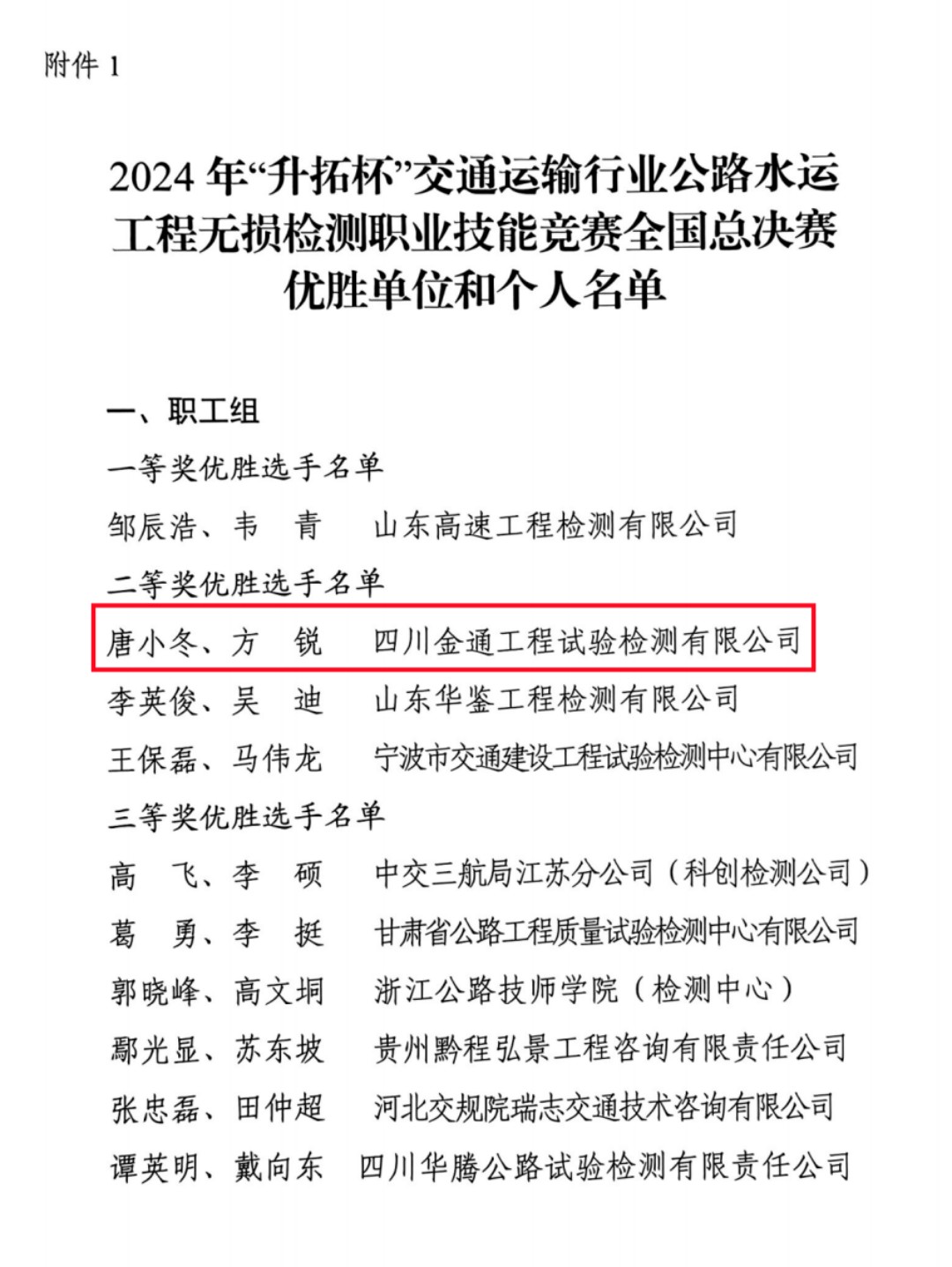 近日,2024年“升拓杯”交通运输行业公路水运工程无损检测职业技能竞赛举办全国总决赛,来自全国22个省、自治区、直辖市交通运输部门选派的职工组和学生组选手同台竞技,展开精彩角逐。其中,由金通检测公司选派的唐小冬、方锐两位职工参赛并获得职工组二等奖的优异成绩,荣获交通运输部“交通工匠”荣誉称号。