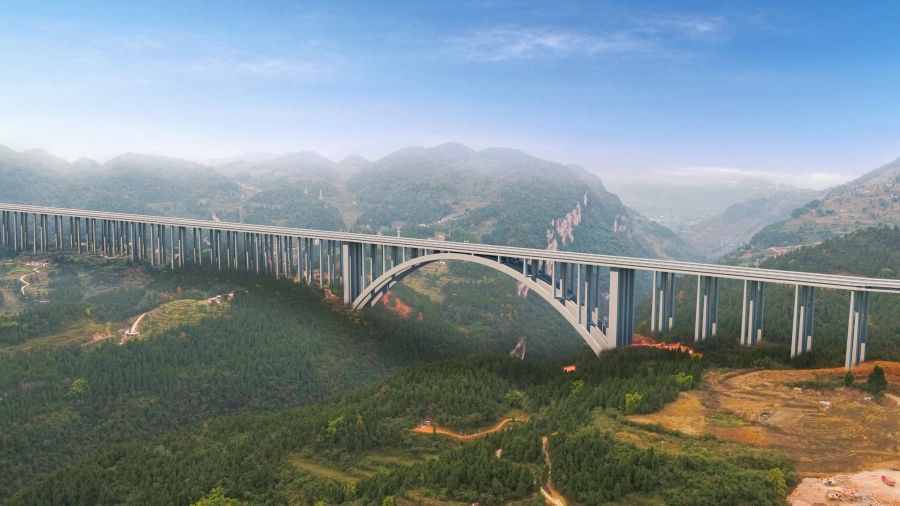 古金高速水落河特大桥,全长1701米,为上承式钢筋混凝土悬臂浇筑拱桥,跨径335米,超过世界已知同类型最大跨径拱桥——美国胡佛水坝大桥332m的跨径,稳居世界第一。