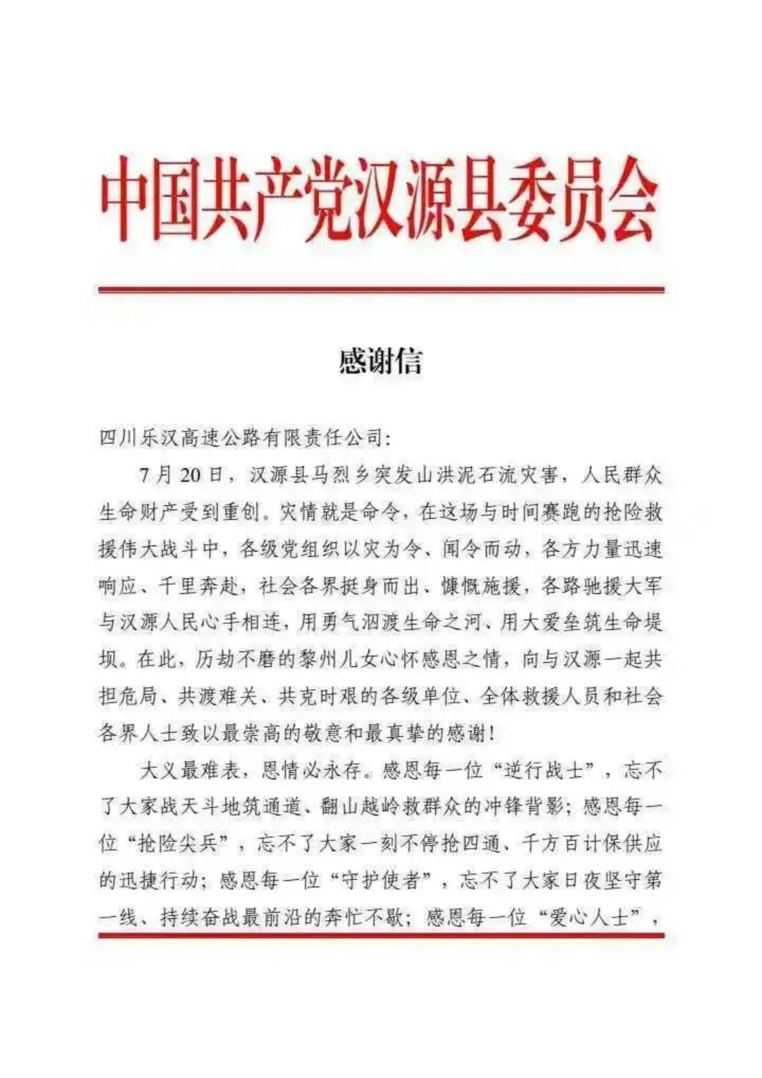 近日,williamhill官网乐汉公司收到来自中共汉源县委、汉源县人民政府的感谢信,以感谢乐汉公司在“7·20”汉源马烈乡突发山洪泥石流灾害应急抢险救灾、保通保畅工作中作出的贡献。