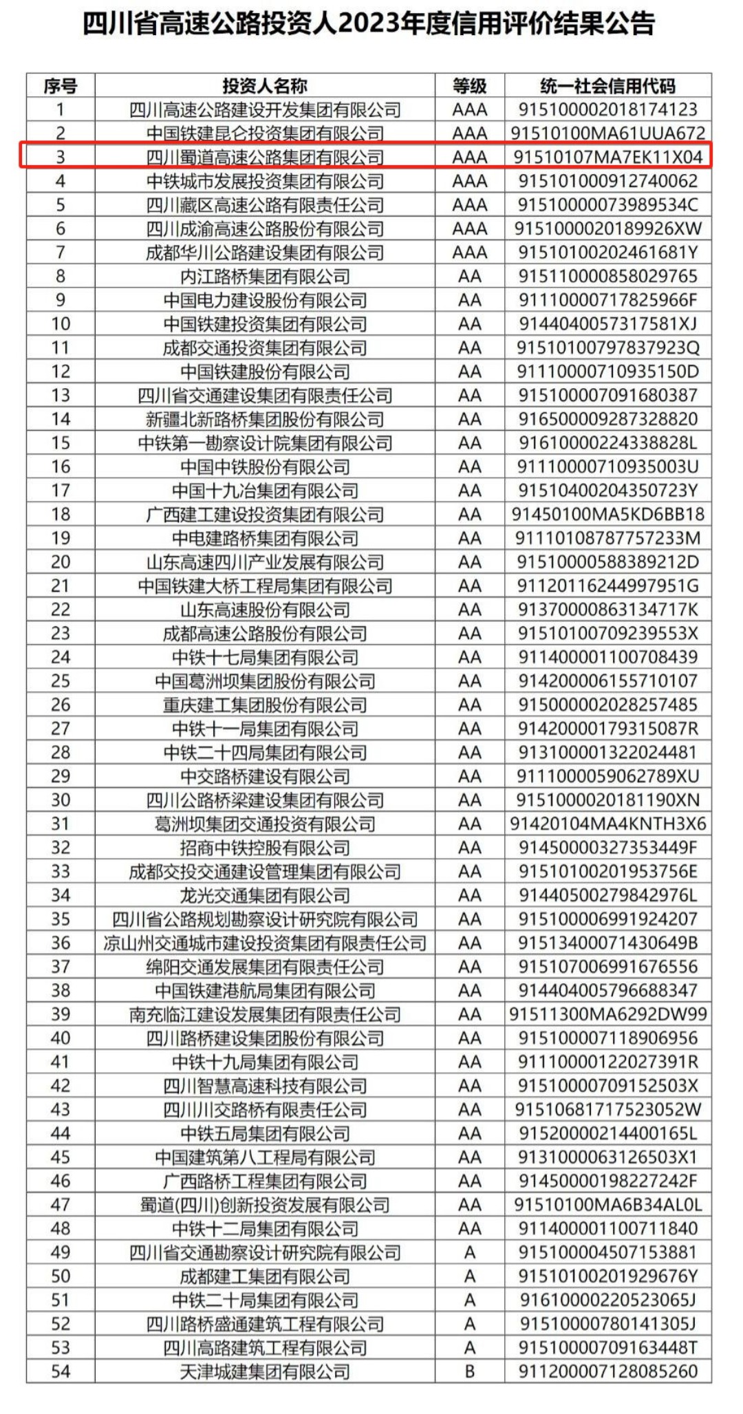 近日,四川省交通运输厅官网发布公告,williamhill官网在四川省高速公路投资人2023年度信用评价中被评为AAA等级。此次评价是根据《四川省交通运输厅关于修订印发<四川省高速公路投资人信用管理办法>的通知》(川交发〔2021〕20号)和《关于加强高速公路投资人年度信用评价的通知》(川交函〔2022〕324号),经初评、审定、公示等程序,取得2023年度信用评价等级名单公布如下: