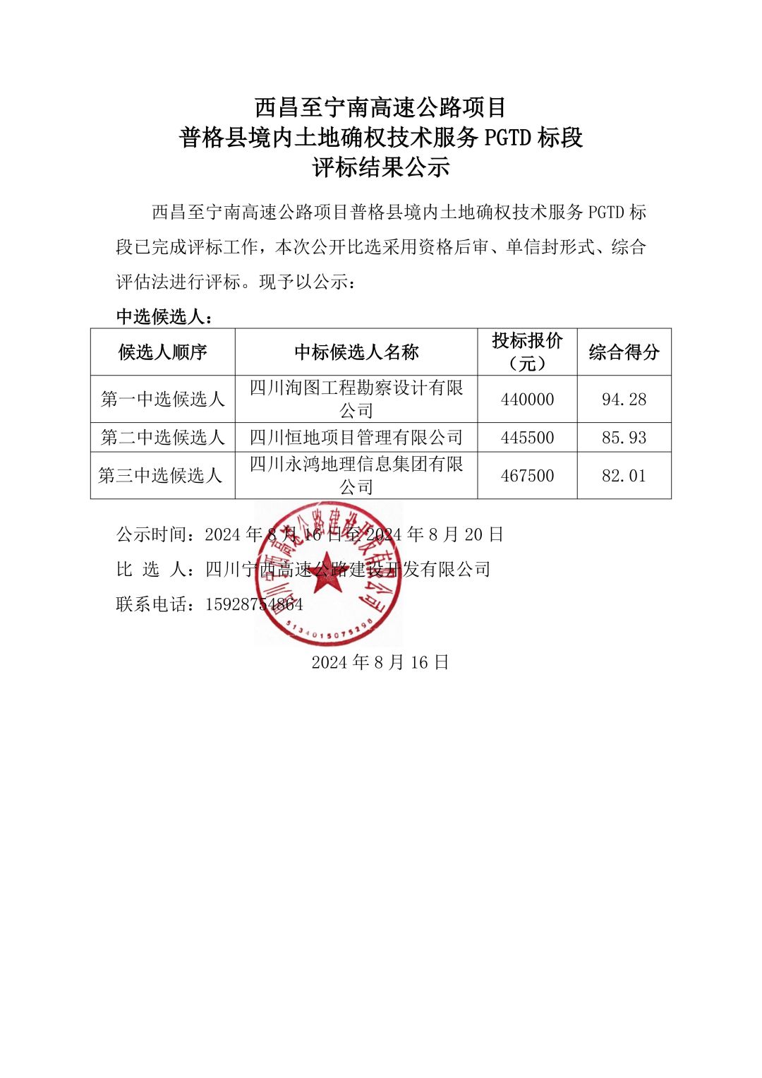 西昌至宁南高速公路项目普格县境内土地确权技术服务PGTD标段评标结果公示