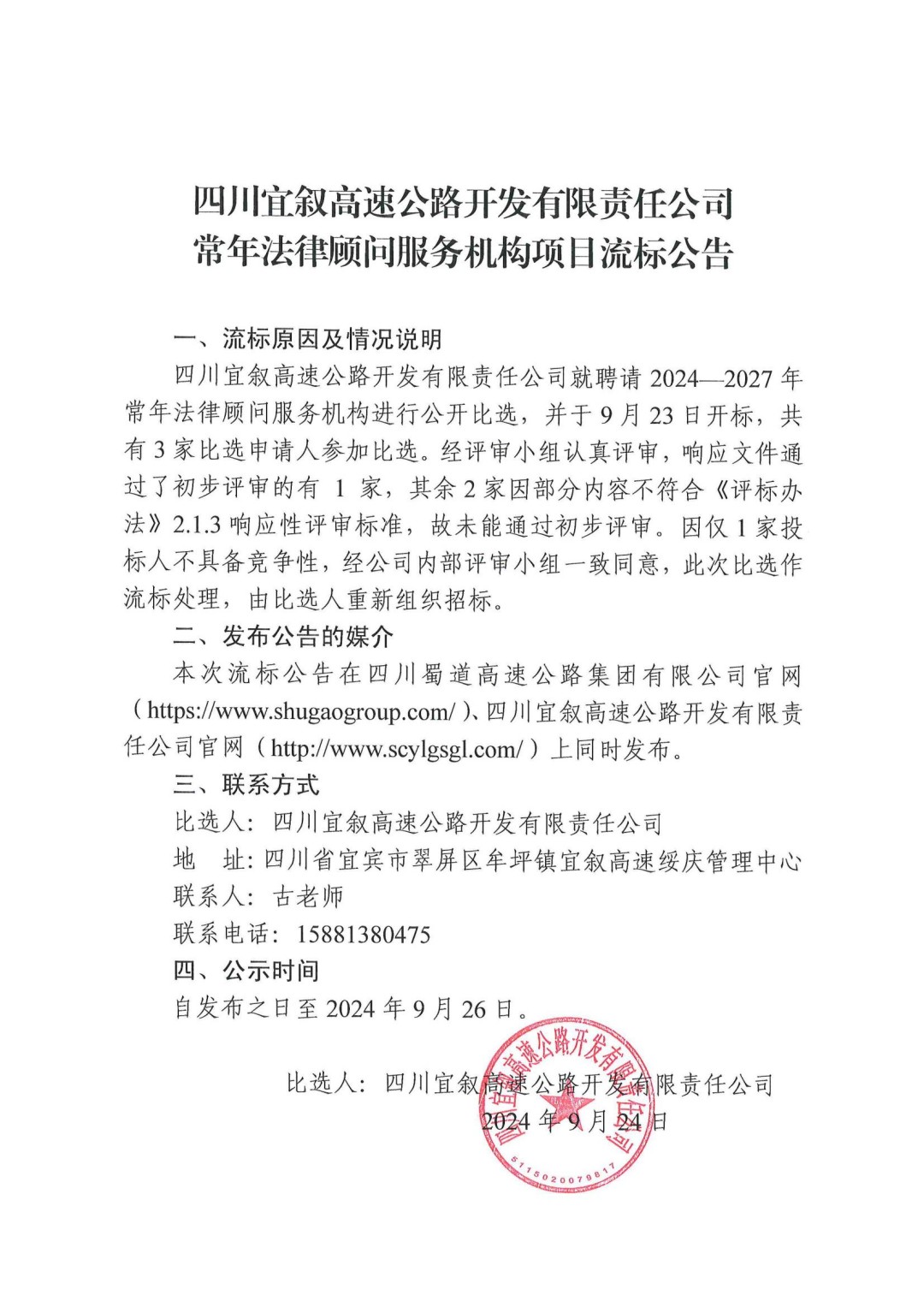 四川宜叙高速公路开发有限责任公司常年法律顾问服务机构项目流标公告
