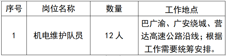 为满足巴广渝(广安绕城、营达)公司(以下简称“公司”)运营工作发展需求,公司现面向应届毕业生开展生产作业类人员招聘工作,具体公告如下: