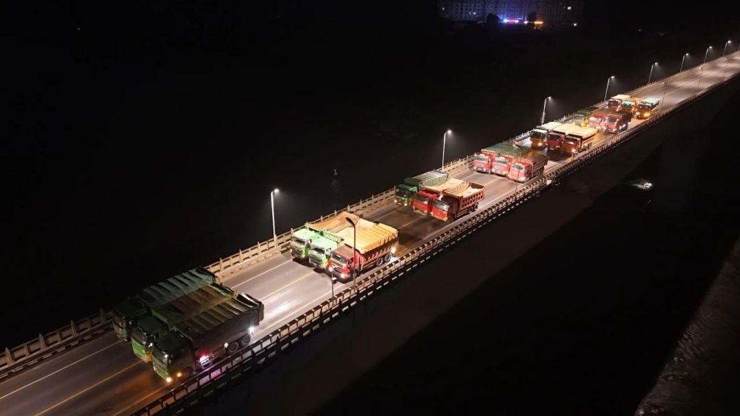 6月2日凌晨,江安长江公路大桥上灯火通明,21辆满载重物共840吨的重型卡车驶上大桥,3辆一排整齐地停放在指定位置,江安长江公路大桥主桥荷载试验正式拉开帷幕。