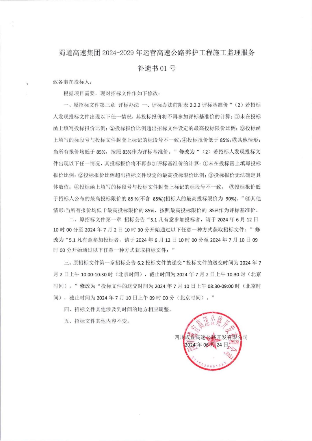 williamhill官网2024-2029年运营高速公路养护工程施工监理服务补遗书01号